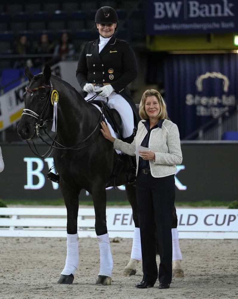 Sir Diamond, geb. 2005, v. Sandro Hit a.d. Lady Diva v. De Niro - Pik Bube, Z.: Stall Troff, Jemgum, B.: Claudia Haller, Düsseldorf, tanzte unter Juliette Piotrowski in Stuttgart in einem Kurz-Grand Prix sowie einem Grand Prix, dem Finale des Piaff Förderpreises, auf den Silberrang. In den vergangenen Jahren sorgten Sir Diamond und Juliette Piotrowski mit mehreren Europameisterschaftsmedaillen für Begeisterung. Mutter Lady Diva präsentierte sich 2001 auf der Elite-Stutenschau in Rastede. Sir Diamond stammt aus dem berühmten Love-Story-Stamm.
