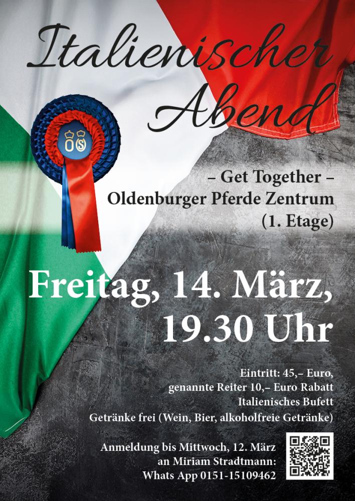 Am Freitag, 14. März um 19.30 Uhr, laden wir Sie herzlich zu einem italienischen Abend in der 1. Etage des Oldenburger Pferde Zentrums Vechta ein. Genießen Sie ein köstliches italienisches Buffet und eine erlesene Auswahl an Wein, Bier und alkoholfreien Getränken, die im Preis inbegriffen sind.