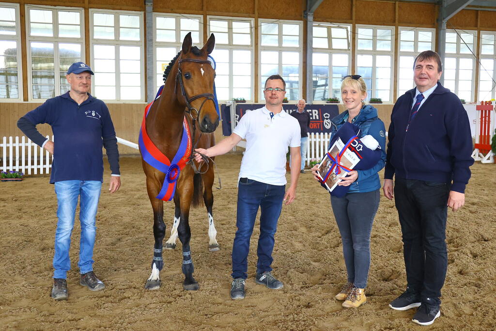 Foto: v.l.: Matthias Schneider, die Siegerin der dreijährigen Springpferde 2024 v. Kassander van’t Roosakker und ihr Besitzer Tobias Kunze, Katja Ehrlich und Richter Hanjo Menck. (Brit Placzek)