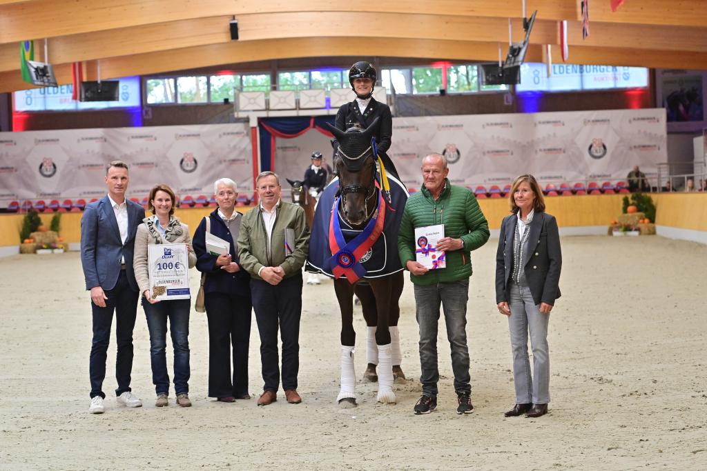 Vaida - Girl OLD, geb. 2017, v. El.H. Vitalis a.d. El.St.Pr.St. Stella Girl v. Stedinger, Z.: J.J.Blonk, Lienen, B.: Ulrich Oberscheid, führte nach ihrem zweiten Platz in der Qualifikation zu den OLD Masters auf dem Anakenenhof in Pinneberg im heutigen Finale die Ehrenrunde an. „Der unheimliche Kampfgeist im Viereck für ihren Reiter macht diese Stute unheimlich ehrlich. Wir wachsen immer weiter zusammen“, freut sich Bianca Nowag-Aulenbrock nach ihrem Siegesritt, der auch von dem fachkundige Publikum mit viel Applaus belohnt wurde. Vaida - Girls Mutter, die Elite- und Staatsprämienstute Stella Girl, brachte bereits die Intermediaire II-erfolgreiche Oldenburger Hauptprämienanwärterin Amouretta v. All at once unter Rocco Di Pierro/ITA sowie die beiden Oldenburger Hauptprämienanwärterinnen Anne-Girl v. All at once, die 2018 auf dem Brillantring in Rastede paradierte, sowie Roxana Girl v. Rockabye S, die im Rahmen der Frühjahrs-Elite Auktion nach Großbritannien zugeschlagen wurde.