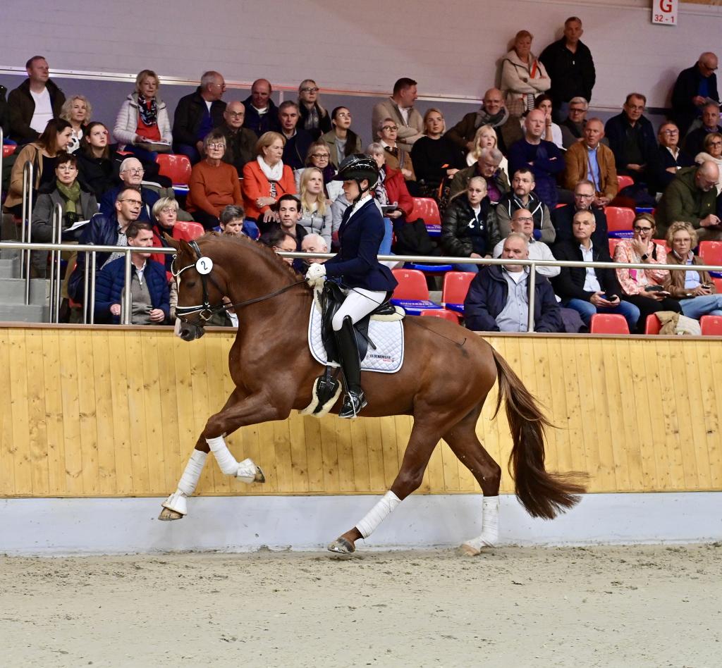 The licensed stallion and bronze medal winner of the Oldenburg State Championships Brut d'Argent, born in 2022, by Benicio out of Delphi by MH by Vivaldi-Don Davidoff, bred by Frank Kolbeck from Steinfeld and owned by the Klose, Hess, Lantemann, Mimberg from Bielefeld, trots to the top price at the 104th Autumn Elite Auction. After an exciting bidding duel, he was sold for €85,000 by auctioneer Christoph F. Rowold to a dressage stable in Bavaria. Brut d'Argent's dam is a sister to Grand Prix winner Sir Davidoff by Raphael Netz. Granddam Dubai is a sister to Grand Prix star Di Sandro OLD, ridden by Austrian Diana Porsche.