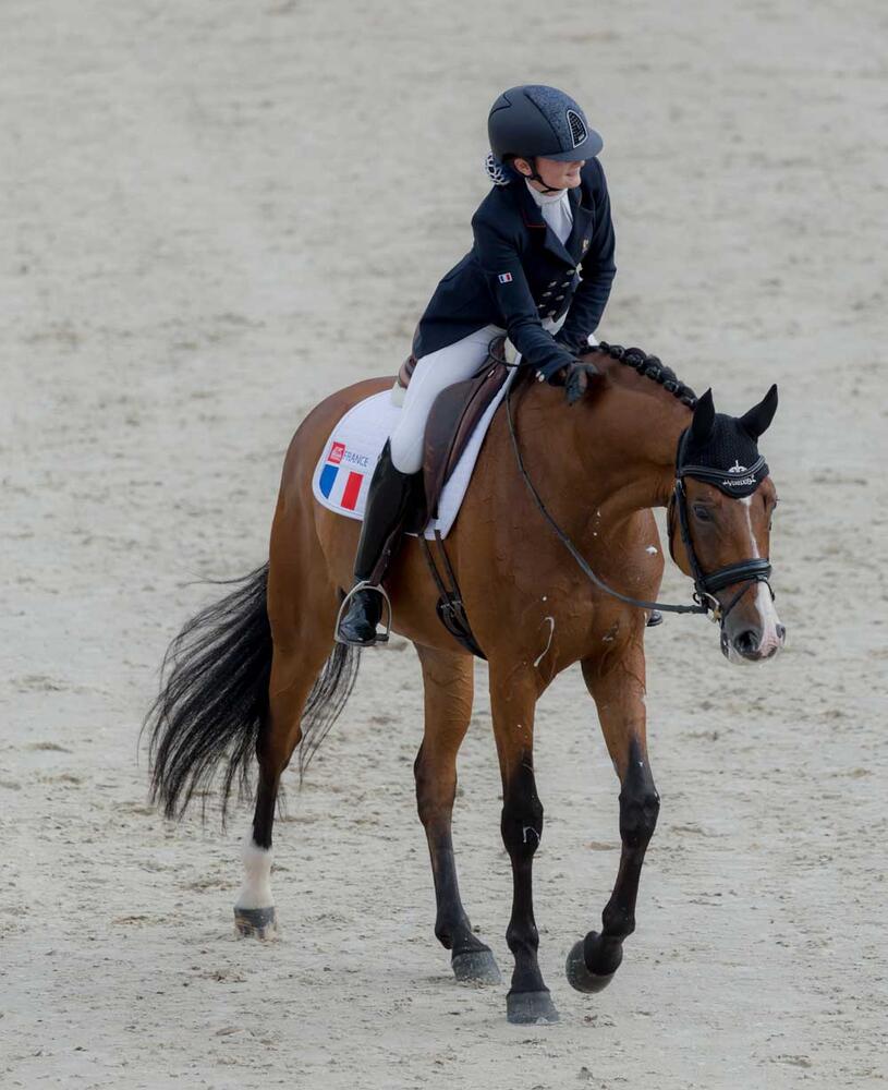 Foto unten: Scarletto v. Sandro Hit startete seine Karriere 2011 in Vechta. Unter der Französin Mathilde Juglaret begeisterte er bereits mit Einzelsilber und Teambronze bei der EM der Children im vergangenen Jahr. (Dufil)